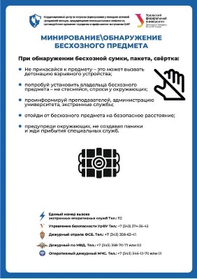 — Категорически запрещается трогать, вскрывать, передвигать или предпринимать какие-либо иные действия с обнаруженным предметом. — Не рекомендуется использовать мобильные телефоны и другие средства радиосвязи вблизи такого предмета. — Необходимо немедленно сообщить об обнаружении подозрительного предмета в полицию или иные компетентные органы.